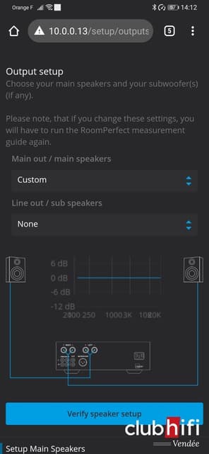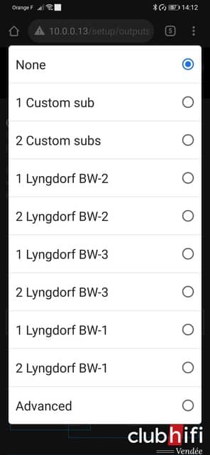 Dans l’onglet « Output setup » on peut configurer le type de système choisi ( stéréo, stéréo avec un caisson, stéréo avec deux caissons, enceintes Lyngdorf, … ).