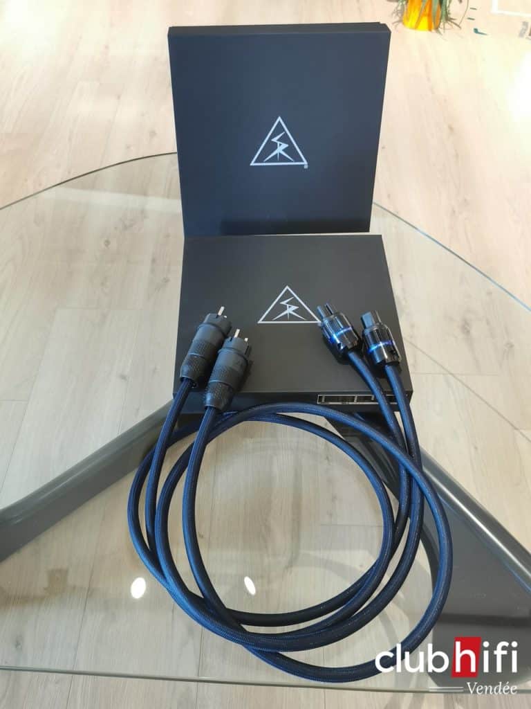 Dans un premier temps, je laisse les câbles secteur d’origine sur le MA9000 ainsi que le Melco. Ensuite, je choisis de câbler le MA9000 avec le Venom V10 NR.