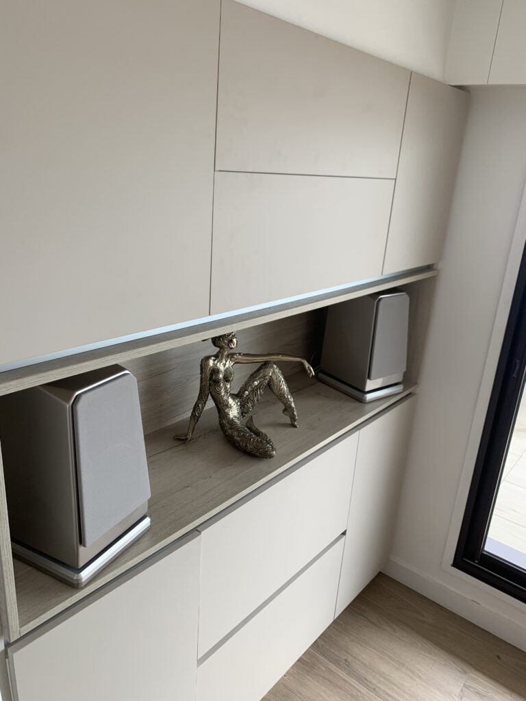 Ces merveilles d’enceintes bibliothèques sont alimentées par un Lyngdorf TDAI3400 qui fonctionne en ROON READY et avec le calibrage Room Perfect. Pour un résultat visuel parfait, l’amplificateur est dissimulé dans le meuble situé en dessous des enceintes.