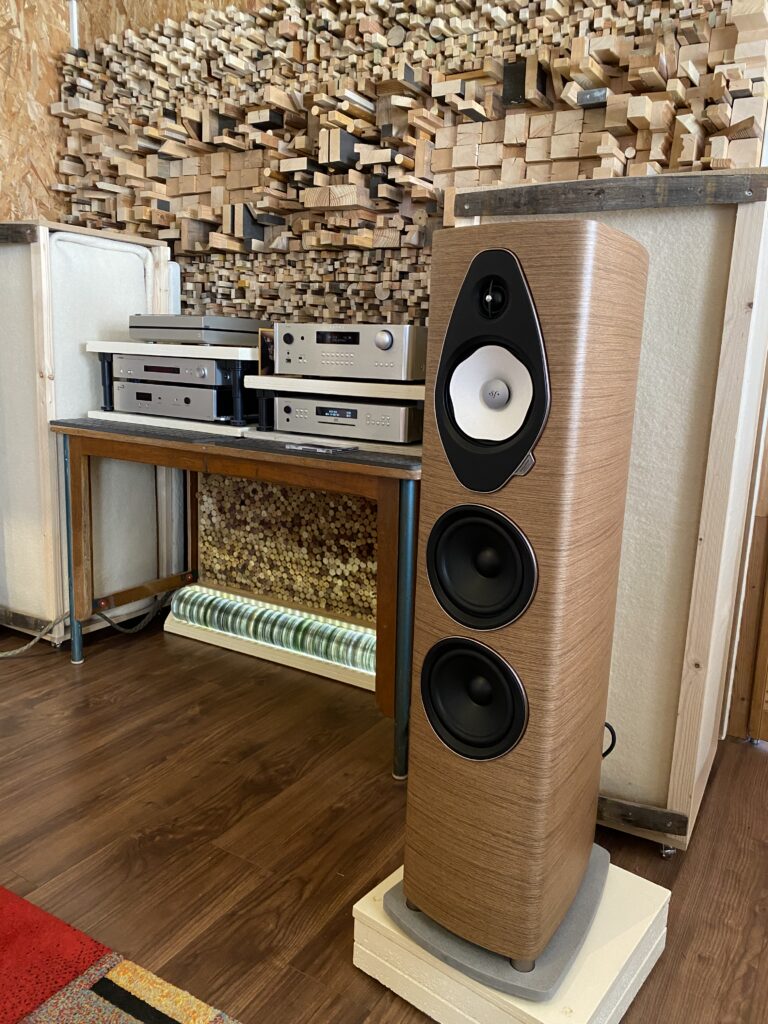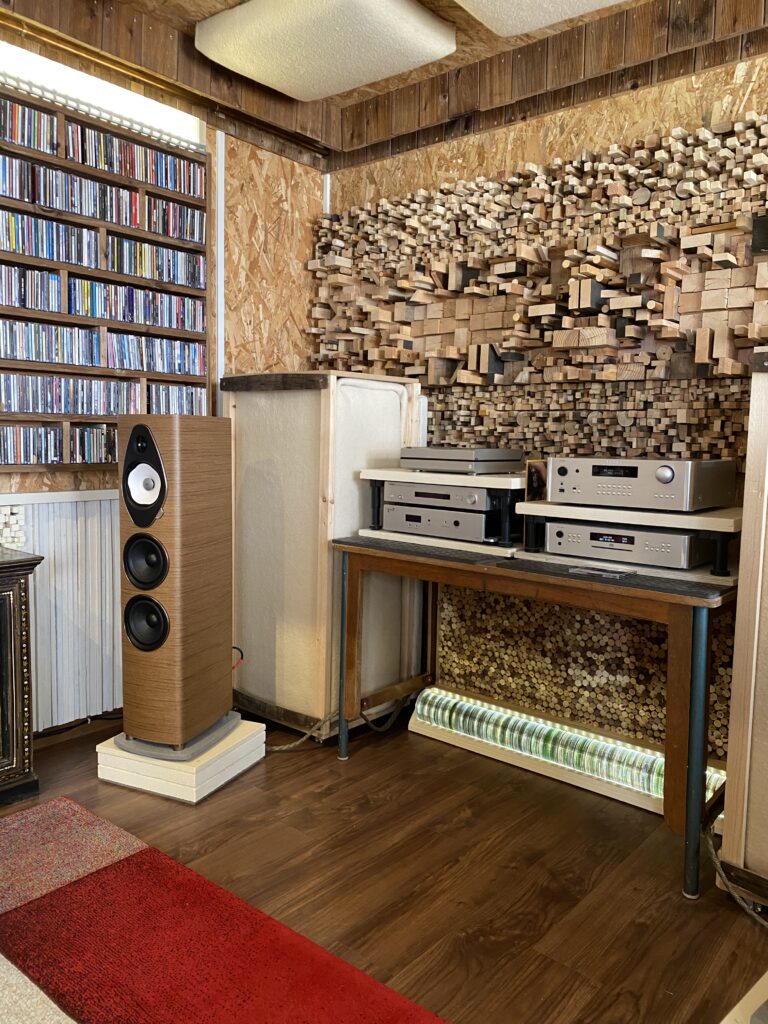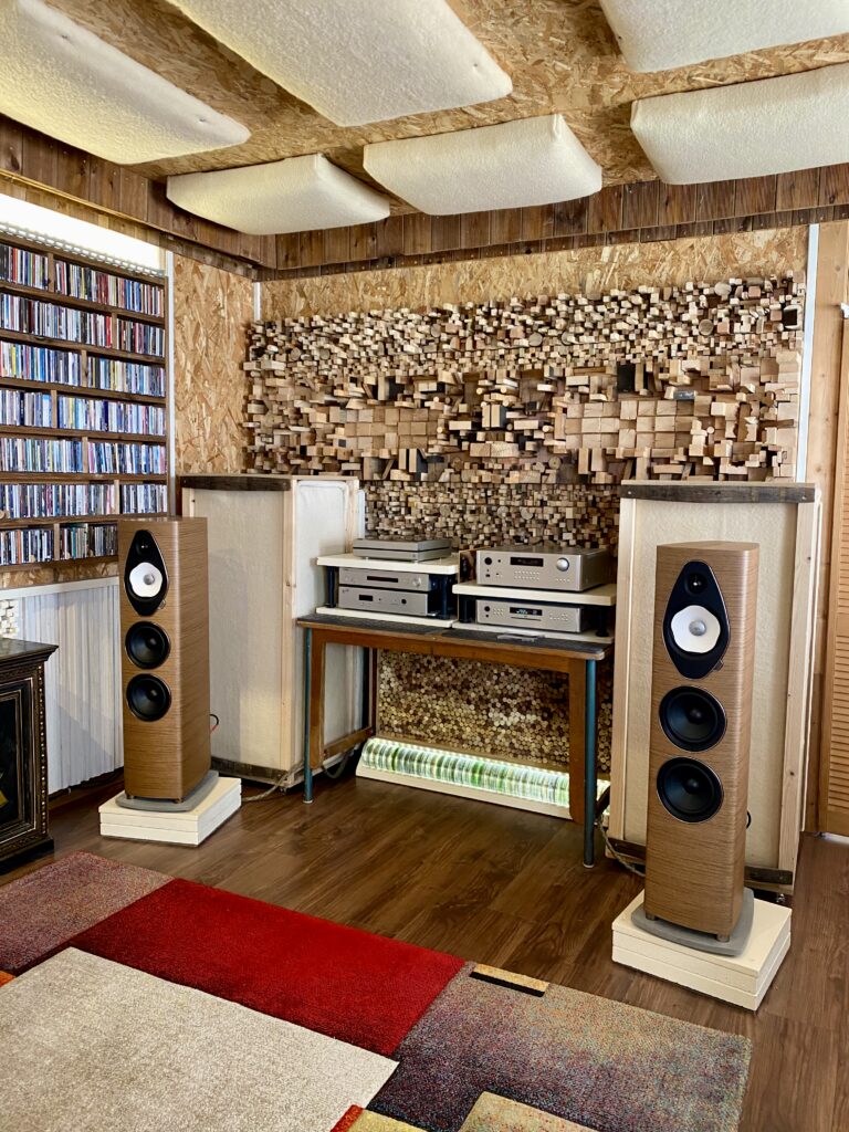 Les nouvelles enceintes, alimentées par un amplificateur Rotel RA-1592, s’intègrent parfaitement dans une très belle pièce d’écoute bénéficiant d’un traitement acoustique maison aussi efficace que discret. Le résultat est tout simplement convaincant : selon ses propres mots, le son est désormais plus homogène dans toute la pièce, plus précis, plus doux, avec une scène sonore élargie — exactement ce qu’il recherchait.