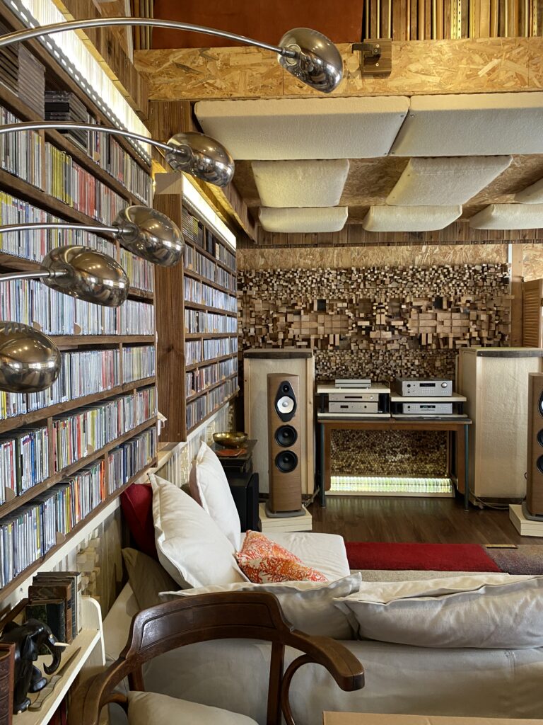 Côté esthétique, le bond en avant est également remarquable. La finition walnut des Sonetto V G2 apporte une chaleur naturelle qui s’harmonise parfaitement avec le style du lieu. Une enceinte qui trouve toute sa place dans cet espace dédié à la musique, où trône une très belle collection de CD, écoutée avec le lecteur Rotel RCD-1572.