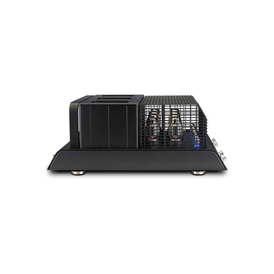 Pour ce 70ème anniversaire, McIntosh met en avant un tout nouveau design : le châssis du MC2152 est désormais en aluminum sablé anodisé noir, complété par des panneaux latéraux mats, en fibre de carbone. La façade a également été repensée avec une superbe découpe au laser du logo McIntosh, rétroéclairé, et même les tubes se voient protégés par une toute nouvelle grille élégante. Le MC2152 est coiffé d’une plaque de verre sérigraphie, reprenant le schéma de l’appareil, et sous laquelle sont logés aux extrémités les deux transformateurs de sortie Unity Coupled et au milieu, le transformateur d’alimentation.