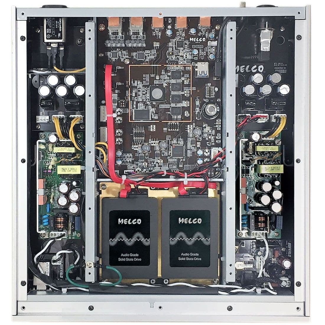 Conçu pour les audiophiles, il bénéficie d’une fiche technique de haut vol, avec ses deux alimentations, son châssis en aluminum anodisé et sa conception interne en H afin d’isoler l’électronique des vibrations indésirables. Enfin pour parfaire le tout, le serveur repose sur quatre pieds anti vibratoires de la marque TAOC. Concernant sa double alimentation linéaire, l’une est dédiée aux deux disques SSD et a ainsi été conçu spécialement pour répondre aux spécificités des SSD en terme de puissance et de stabilité, tandis que l’autre concerne l’alimentation des circuits.