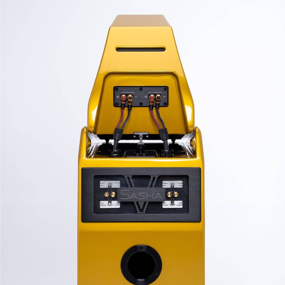 La nouvelle Sasha V bénéficie du travail titanesque en matière de recherche et développement de la marque, notamment sur les matériaux. Ainsi, sa fabrication s’articule, tout comme l’Alexia V et l’Alexx V, autour du V material, un matériau composite maison. Elle possède aussi de nouvelles pointes, les Acoustic diodes, présentées la première fois sur l’Alexx V. Elle intègre également le médium QuadraMag développé pour la Chronosonic XVX, l’une des plus grandes enceintes de la marque américaine.