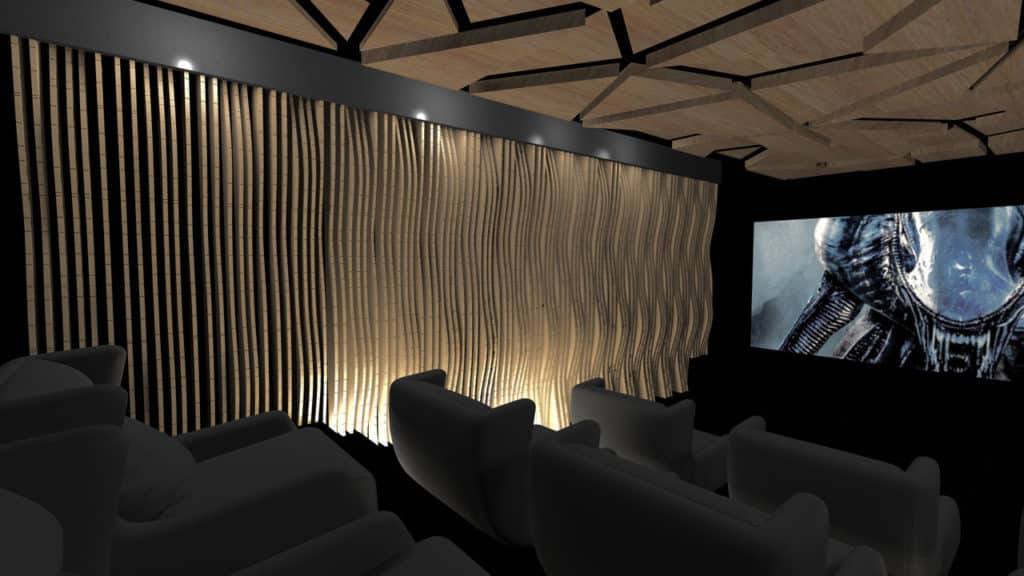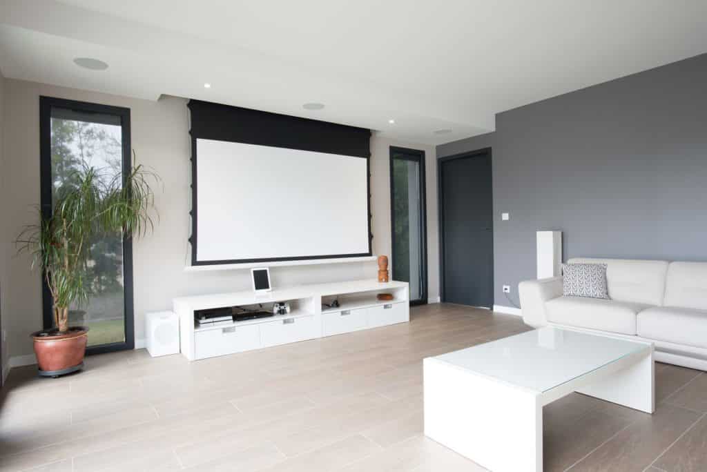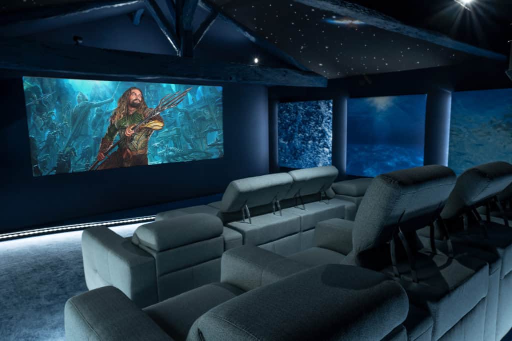 Dans une pièce dédiée : écran cinémascope en taille maximale, contraste optimisé, qualité sonore optimale, pression acoustique idéale, traitement acoustique et décoratif.